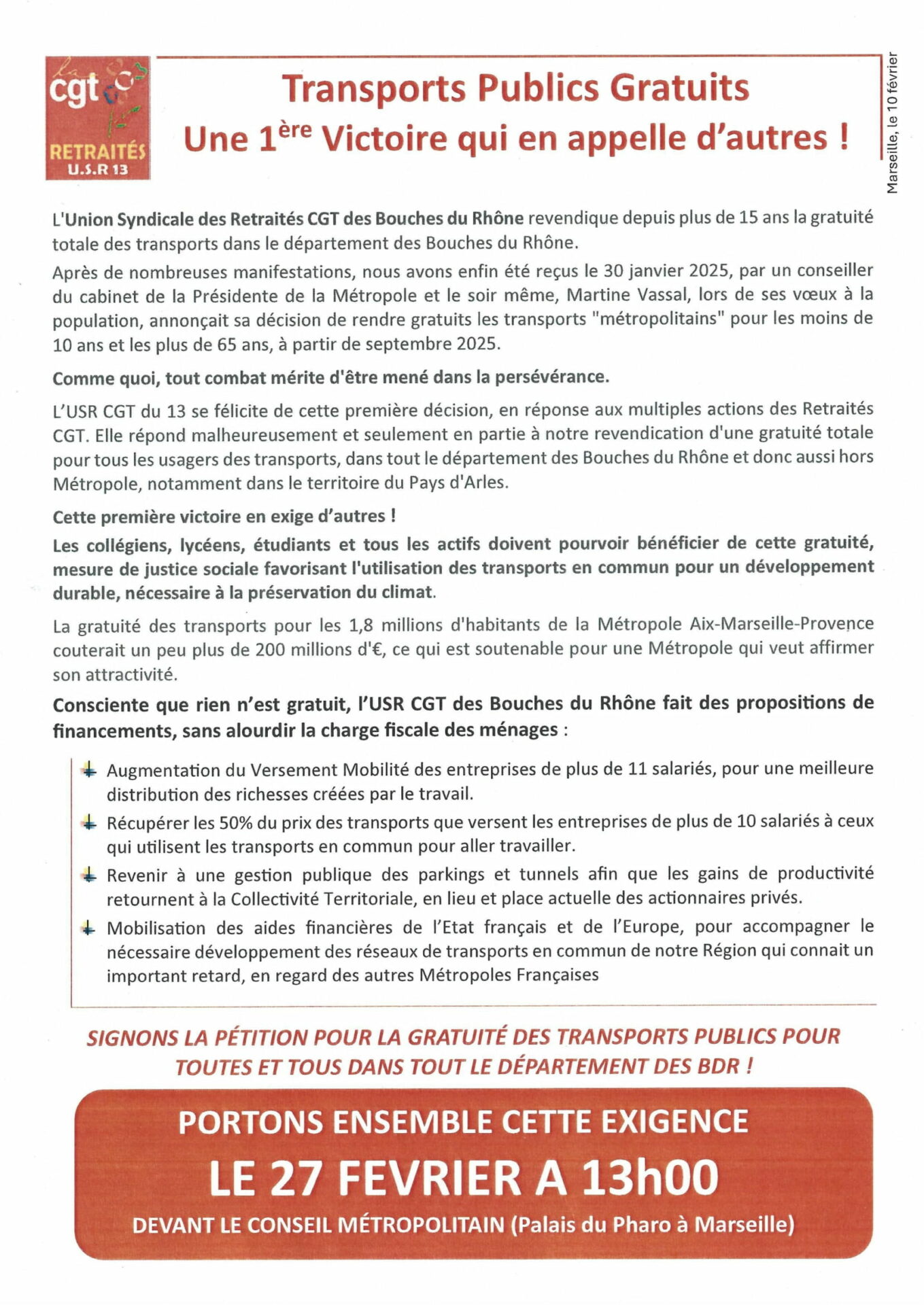 PORTONS ENSEMBLE CETTE EXIGENCE LE 27 FEVRIER A 13H00 DEVANT LE CONSEIL METROPOLITAIN (Palais du Pharo à Marseille)