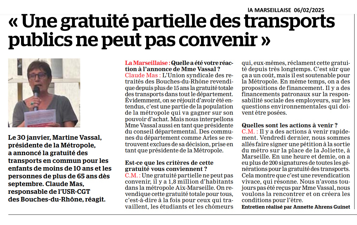 Article de « La Marseillaise » du jeudi 13 février 2025 transports publics gratuits