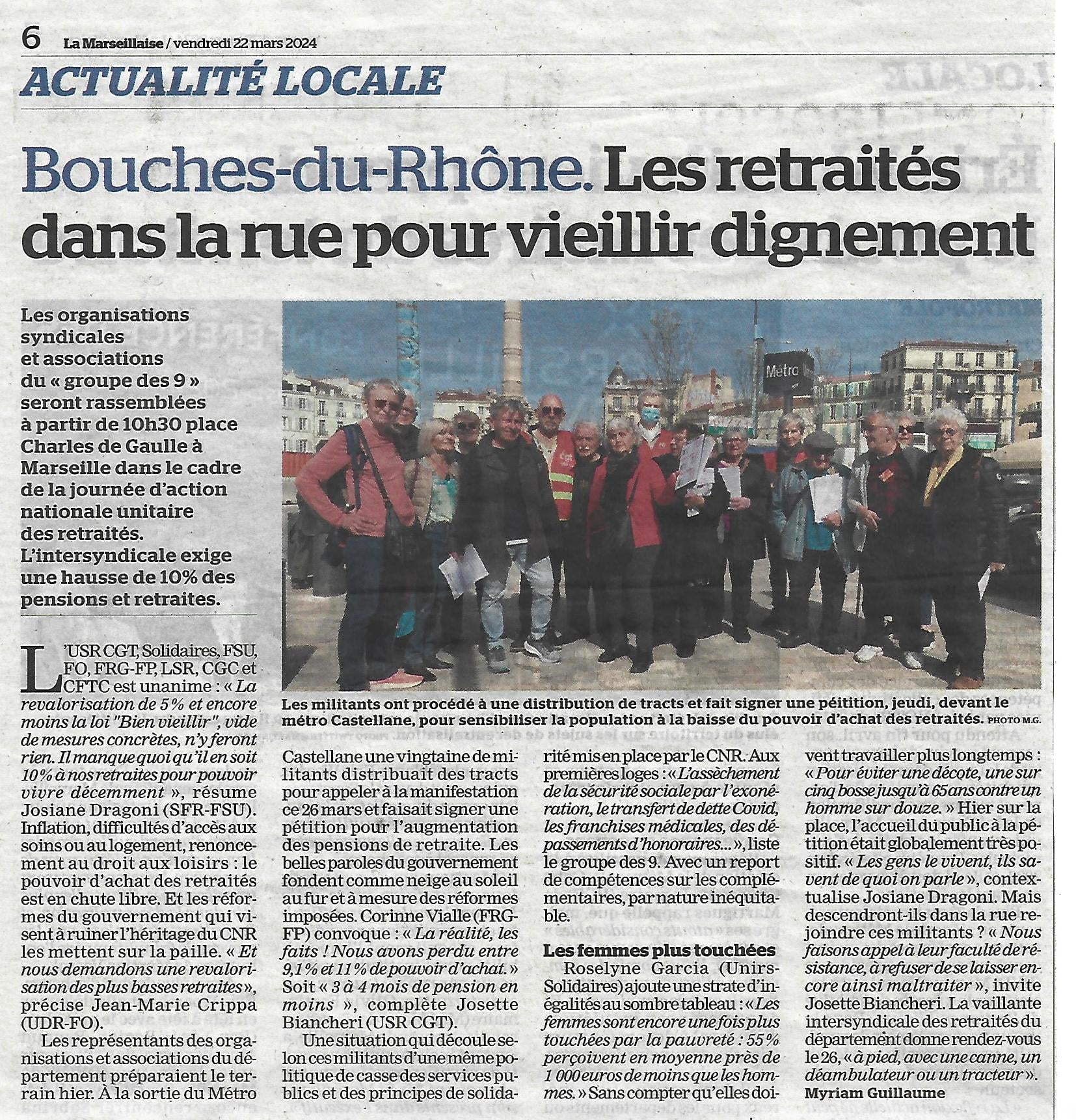 L’intersyndicale départementale ce jeudi 21 mars à sortie du métro Castellane pour distribuer le tract du groupe des 9 organisations syndicale et associations de retraités, appelant à manifester le mardi 26 mars avec un rendez-vous à 10h30 place du général de Gaulle.